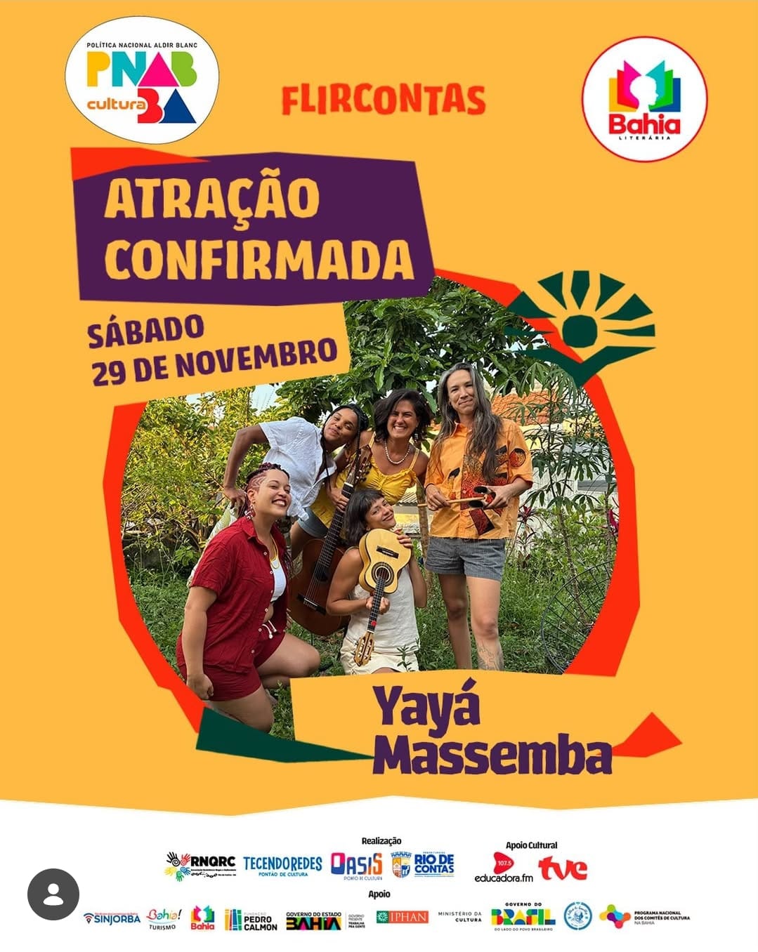 No dia 29 de novembro, o grupo musical Yayá Massemba desembarcará em Rio de Contas para fazer o público dançar, cantar e curtir. Venha prestigiar!